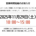 11/29(土)ひでじビール醸造所売店 営業時間変更のご案内