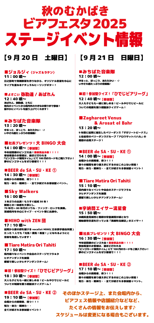 音楽ステージやダンス、そしてお客様参加型の名物イベント「BEER de SA・SU・KE」などなど、ぜひお楽しみください!
