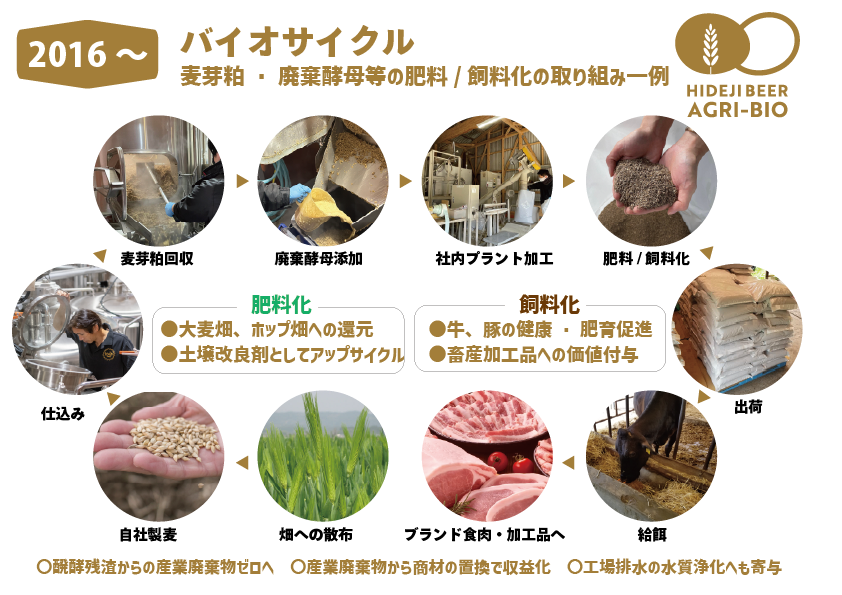 肥料として活用される資材は、土壌改良剤として作物の根の成長と抵抗力をアップさせ、丈夫で元気な食物へ。そしてひでじビールの大麦畑やホップ畑にも活用され、「農のサイクル」を確立。