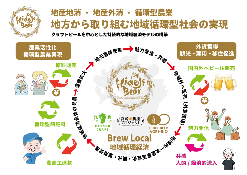地域の素材を使ったビールを醸造し、地域とビールの魅力を発信、それに共感頂ける皆様へ、国内へ、世界といった地域外へ販売をすることにより「外貨」を得て、地域内の一次産業活性化、観光、雇用促進。